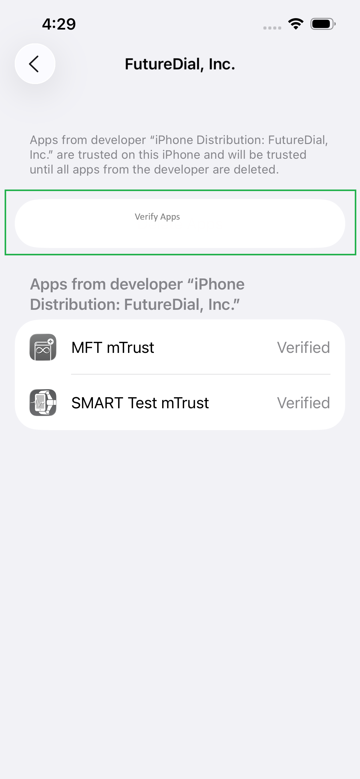 After the FutureDial software has loaded the Enterprise MFT app onto your device, before you can launch the app it needs to be manually verified. In order to do so, follow the steps shown below